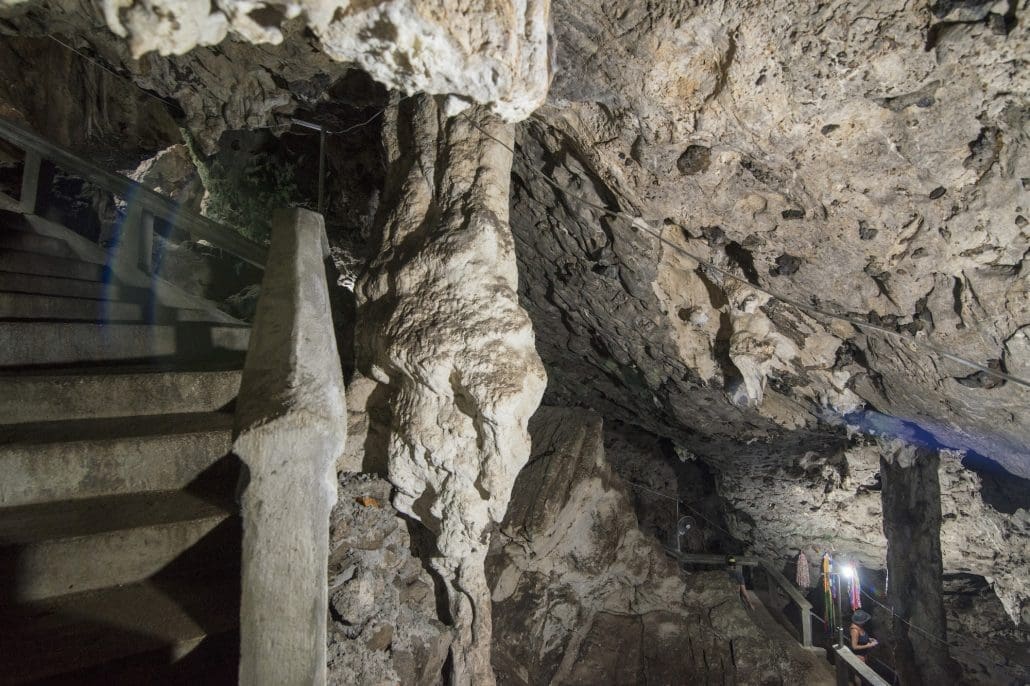 Now a place of peaceful beauty is in sharp contrast to its grisly history. The Killing Caves were the setting of horror where countless bodies were thrown during the Khmer Rouge Regime. Today there is a large glass memorial in the cave next to the skulls & bones. A golden reclining Buddah can be reached by staircase. Another memorial assembled from cyclone fencing and chicken wire contains human bones at the base of the stairway.