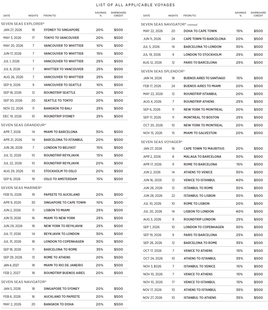 Black Friday Bonus offer is capacity controlled and applies to new bookings only made between November 14 and December 2, 2025. Guests will receive savings of up to 40% on select voyages in select suite categories, plus a $250 USD Shipboard Credit per guest, up to $500 USD per suite. Offer is valid only for residents of the US and Canada who either book directly with Regent Seven Seas Cruises® or through travel advisors located only in the US and Canada. Availability is limited, and restrictions apply — applicable voyages are subject to removal at any time without notice; savings amounts are subject to change. Offer may be withdrawn at any time without prior notice. For complete Terms & Conditions, please visit www.RSSC.com/Black-Friday-Bonus. Mention promo code “BLACK FRIDAY” at time of booking. Ships’ Registry: Marshall Islands & Bahamas. ©2025 Regent Seven Seas Cruises.